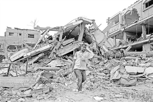 11月12日,一名男子在加沙地带南部城市汗尤尼斯清理建筑废墟。