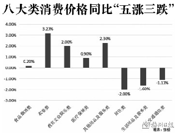 与上月相比,八大类消费价格呈“六涨一跌一平”态势。上涨类别有食品烟酒类、居住类、生活用品及服务类、交通通信类、教育文化娱乐类、其他用品及服务类,涨幅分别为0.1%、0.1%、0.9%、0.4%、0.6%和0.3%;衣着类环比下跌0.4%;医疗保健类价格持平。