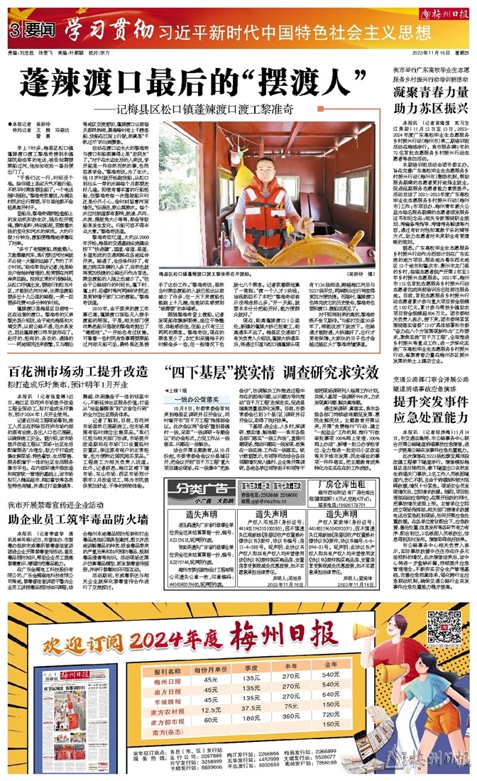 蓬辣渡口是梅县区目前唯一还在运营的渡口。黎准奇的父亲黎光崇介绍说,由于地处梅县和大埔交界,以前公路不通,但水系发达,因此蓬辣渡口很早就存在了。赴圩的、经商的、务农的、通婚的……两地居民往来频繁,又与潮汕等地区交流密切,蓬辣渡口以前每天都很热闹,最高峰时有上千艘客船、货船在江面上行驶,那真是“千帆过尽”的壮阔景象。