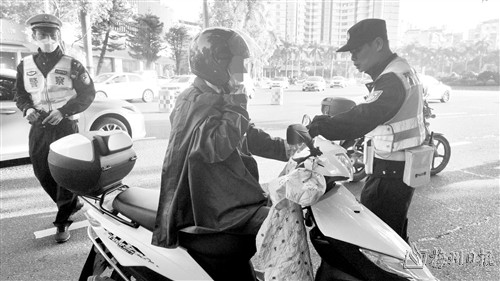 17日上午,记者在嘉应中路圆盘路段看到,市民用来抵御寒风的方式多种多样。不少市民使用“挡风被”或者在车把上固定手套,有些“挡风被”挡到驾驶员脖子处,双手和身体不断向前探,而有些市民则选择反穿羽绒服、厚外套、长外套来抵御风寒。执勤民警见此情况,及时将相关车辆拦下,对驾驶员进行耐心劝导,不少驾驶员意识到危害性后,现场拆除了“挡风被”和车把上固定的手套,及时纠正了“反穿衣”的行为。