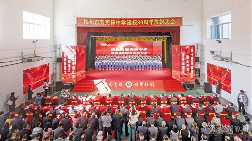 “梅园芬芳三十载,宪梓精神依旧熠熠生辉!‘勤俭诚信’已深入血脉,成为宪中人永不磨灭的记忆,宪梓博士在运动场上投篮的矫健身姿,与学生共餐时和蔼可亲的笑容,高考前为考生加油助威时铿锵有力的声音,已定格在每位宪中人的脑海里,温暖了万千学子。”大会上,梅州市曾宪梓中学校长林敏深情回顾了学校三十年来的办学历程和曾宪梓博士多次访问宪中与师生们相处的点滴故事,致敬曾宪梓博士爱国爱乡、无私奉献的崇高精神。