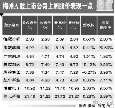 上周,梅州8家A股上市公司股价表现为7家上涨1家下跌,其中嘉应制药领涨,涨幅为10.12%,博敏电子涨幅第二,涨幅为3.66%,仅塔牌集团表现下跌,下跌幅度为0.27%。8家上市公司股价平均上涨2%。