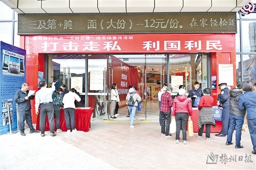 通讯员蕉公宣)日前,蕉岭县公安局联合蕉岭县市场监管局、蕉岭县烟草专卖局到蕉岭县“无私”商圈——奥园广场举行“五进五建”进市场宣传活动。