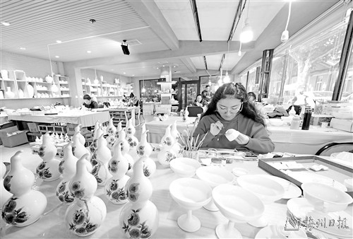 近日,一位工艺美术师在唐山市开平区陶瓷文创产业园创作陶瓷绘画作品。