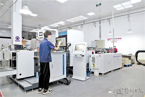 位于五华园区的广东泰金智能包装有限公司是一家从事高档卷烟包装设计、开发、印刷、生产和服务的高新技术企业。其生产的高档卷烟包装主要销往云南中烟、安徽中烟、河北中烟等国内知名中烟工业有限责任公司。走进该公司生产车间,高端自动化生产线按设定工序高速运转,工人们在各自岗位上有条不紊操作机械设备,现场一片火热的生产场景。
