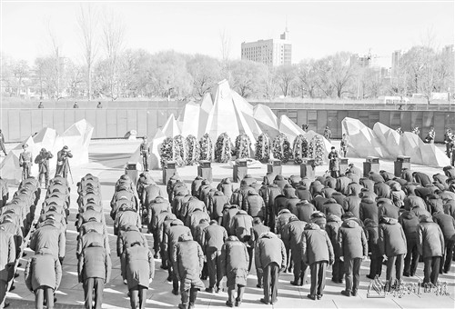 雪后初霁,沈阳抗美援朝烈士陵园松柏掩映,庄严肃穆。铭刻着“抗美援朝烈士英灵永垂不朽”的纪念碑巍峨挺拔。安葬仪式在陵园下沉式纪念广场举行。环形烈士英名墙下摆满了黄白相间的菊花。参加仪式的人们列队肃静,缅怀英烈。
