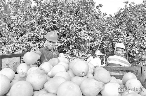 “柚”是一年丰收季,硕果满枝果农忙。走进位于新铺镇北方村的金柚种植基地,600多亩成片种植的柚树挂满了青绿色的柚果,柚农穿梭在林中忙着采摘、装筐、搬运等。