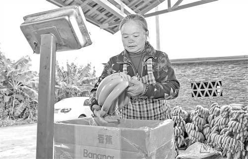 时下正值香蕉成熟采收时节,走进长潭镇麻坑村的香蕉种植园,蕉香溢满山林,蕉农们正穿梭在果园里采收香蕉,一挂挂饱满的香蕉采下后被运送到村里的集散点。该集散点内,几十名工人正忙着对香蕉进行分割、清洗和包装,装箱后发往销售地。“现在是收香蕉的季节,我主要负责清洗包装,一天200元工钱。”正在打包的工人张龙招告诉记者,每年香蕉采摘期他都会过来帮忙打包,能挣一些零用钱补贴家用。