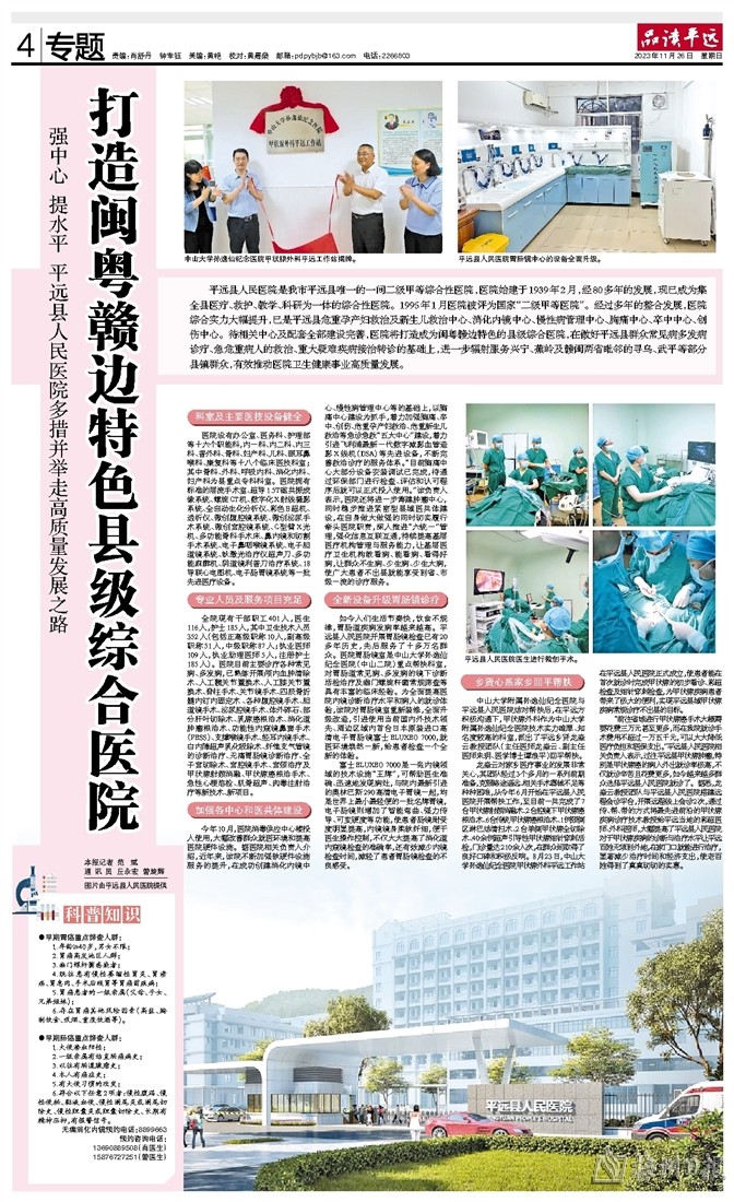 平远县人民医院是我市平远县唯一的一间二级甲等综合性医院,医院始建于1939年2月,经80多年的发展,现已成为集全县医疗、救护、教学、科研为一体的综合性医院。1995年1月医院被评为国家“二级甲等医院”。经过多年的整合发展,医院综合实力大幅提升,已是平远县危重孕产妇救治及新生儿救治中心、消化内镜中心、慢性病管理中心、胸痛中心、卒中中心、创伤中心。待相关中心及配套全部建设完善,医院将打造成为闽粤赣边特色的县级综合医院,在做好平远县群众常见病多发病诊疗、急危重病人的救治、重大疑难疾病接治转诊的基础上,进一步辐射服务兴宁、蕉岭及赣闽两省毗邻的寻乌、武平等部分县镇群众,有效推动医院卫生健康事业高质量发展。