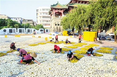 11月25日,在广东省江门市新会区一处空地,人们对新会柑皮进行翻皮晾晒。