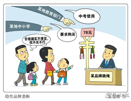 “考试指定这个品牌,学校老师推荐的,价格确实不便宜,但不买不行”……有媒体近期在杭州调查发现,十余年来,当地教育部门长期要求中考使用某一品牌的跳绳,不少中小学以指定或暗示的方式要求学生和家长购买,每根跳绳价格达78元,远高于市场同类产品。 朱慧卿/图