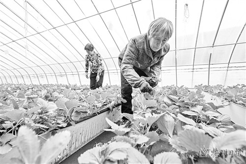 在平山县滹沱河高端设施蔬菜示范区育苗中心,岗南镇南石殿村村民纪翠凤在给草莓去除老叶,促进通风透光。