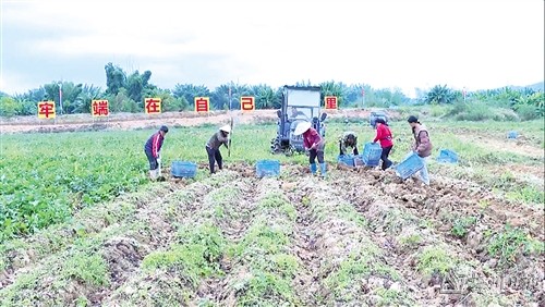 在五华县兴洪种养专业合作社的红薯种植基地,随着红薯收获机在田埂上缓缓驶过,一堆堆个头适中、表皮光滑鲜红的红薯破土而出,摆满田间地头。村民们紧随其后将刚刚出土的红薯去泥、分拣、装筐,现场呈现出一派丰收景象。