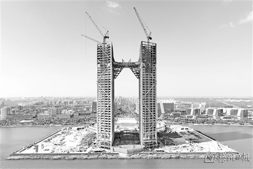 图为这是钢结构锥体提升完成的西岛中银金融中心项目南北塔楼(11月24日摄,无人机照片)。