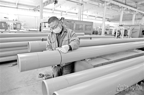 12月1日,位于望都县的河北万利泰欧勒管业有限公司工人在测量PVC管材尺寸。