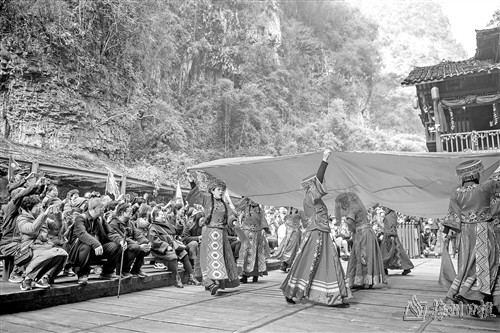 近日,在湖北宜昌市夷陵区三峡人家风景区,演艺人员在为游客进行民俗表演。宜昌5A级旅游景区三峡人家依山傍水、风景如画,它以“一肩挑两坝、一江携两溪”的独特地理位置,每年吸引着上百万游人。