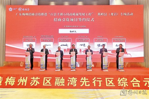 近期,蕉岭县招商引资工作捷报频传、势头正猛。广东梅州招商引资推进“百千万工程”·蕉岭县(龙岩)专场活动日前在福建省龙岩市举行,为蕉岭苏区振兴发展注入新动能,有力推动蕉岭加快融湾入海、打造示范窗口。活动现场举行了6个项目签约仪式,总投资37亿元,涵盖电子科技、食品工业、现代农业、新材料、环保等领域。