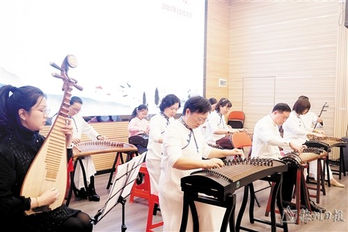 活动现场还举行了广东省广东汉乐学会、梅州客家筝艺术团交流联谊活动,由梅州客家筝艺术团带来筝琶胡箫合奏客家筝曲《寒鸦戏水》(如上图,黄钰然摄)、广东汉乐《风吹柳-春之花》,广东省广东汉乐学会合奏广东汉乐《琵琶词》,表演者飞指拨弦,美妙的琴声动人心弦。随后,双方自由和弦,并共同合奏《锦上添花》,为现场观众带来一场视听盛宴,展现了中华优秀传统文化的独特魅力。