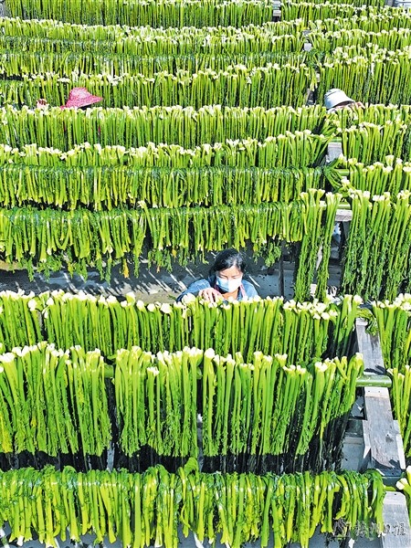 12月7日,记者走进黄沙村的田间地头,只见半人高的梅菜长势喜人,村民们正在进行收割;梅菜加工厂里,漂烫机“嗡嗡”作响,新鲜的梅菜经过清洗和蒸煮,散发出独有的清香,菜农们正忙着将煮过的梅菜搬运到架子旁,在太阳下进行晾晒。