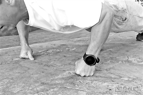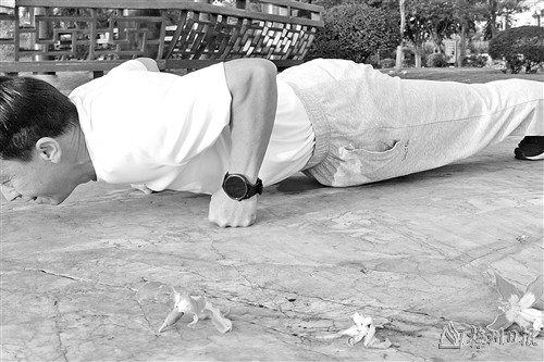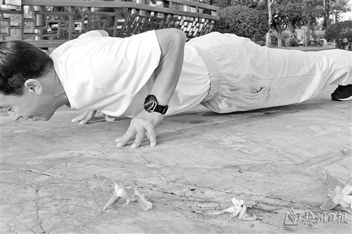 每天清晨,58岁的赖叔都要到梅城剑英公园锻炼。他最喜欢做俯卧撑,方式很特别,轮流切换用十指或双拳支撑身体,一口气能做40多个,让很多年轻人佩服不已!(图/文 山峰)