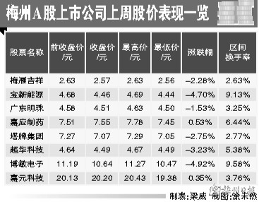 梅州8家A股上市公司上周股价表现为6家下跌2家上涨,涨少跌多。其中,嘉应制药领涨,但涨幅也仅为0.53%,博敏电子领跌,跌4.92%,整体上涨跌幅波动不大。表现最活跃的是博敏电子,日均换手率为9.58%,其次是宝新能源,换手率为9.13%。梅雁吉祥活跃度最低,换手率仅有2.63%。