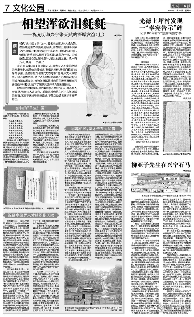 祝允明的这段经历,因“虽仕亦不甚显”等因,并不为人所重视,也较少人去研究。现谨就祝允明在兴宁与张天赋的友谊,笔者不揣浅陋作些论述,不妥之处请专家学者批评指正。