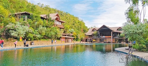 沿着石板路往里走去,一座1300多平方米的巨型温泉游泳池最为亮眼。长条形的泳池一头小一头大,形如葫芦状,又好像一个穿裙子熟睡的少女,微风吹过水面,隐隐泛起小小的涟漪,就像少女甜美梦境中的笑颜……一座座造型各异的屋、寮、阁沿温泉泳池而建,泳池边上是旧船木铺设的人行道,不少游客在戏水拍照,一幅美丽的青山绿水风景画呈现在眼前。池边干栏式的吊脚楼全部采用俄罗斯松木,屋顶覆盖茅草,自然朴素中带着几分华丽,一派傣族风光,让人产生好像到了西双版纳州橄榄坝傣族园的错觉。民宿馆依山而建,其材质以木质家具和客栈风格相结合,木屋与山景融为一体。景随步移,恍若仙境。