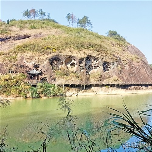 进入景区大门后往左走,是一条通往青龙岩下的小径。我们沿着潭上栈道小径,听着导游的简介,不久就来到了一座峭壁凌空的百丈大石山下。只见巨岩上接蓝天,下临深渊,整个石山如青龙入潭,故而得名。突兀的大石山上缀着形态各异的大大小小的许多岩洞。行进不久,便看见了一座琉璃黄瓦的庙门,石门框上写着“龙岩仙府”四个淡黄的字体。向左沿着阶梯上去就是千年古刹“龙岩古寺”。从寺门进入寺庙,殿堂中供着一尊大佛像,从殿堂边侧拱门进去,走完过道,靠墙扶梯向上折,便可以与岩上的岩洞亲密接触。岩洞边有人工建造的悬桥,我们小心翼翼地向上攀登,途中有许多大小的岩洞石窟,有些洞凿孔连接,岩洞星星点点、大小相间,令人眼花缭乱。站在狭小的悬空栈道,往陡峭的下面观望,下面清澈的碧潭、山丘密林等美景尽收眼底,但也会有一种眩晕的感觉产生。真是无限风光在险峰,我们也在惊险的刺激中一饱眼福。从岩上栈道下来,就能看见岩壁正中石刻有一尊大观音像,左右两边则各有三尊姿态相似的小观音像。