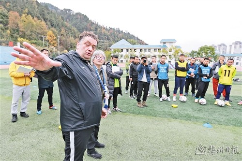 图为英国大使馆文教处足球发展高级经理利特(前)为参加“学转英超”基层足球教练培训项目的学员授课。