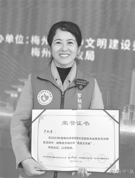 “每次看到受助人开心的笑脸、一点点积极的变化,我都感到无比快乐和满足,这也是我坚持公益的动力来源。这次被评为2023年梅州市学雷锋志愿服务‘最美志愿者’,我感到很荣幸,接下来我将不忘初心,一如既往地积极投身公益事业,为社会奉献自己的力量。”罗秋芳说。