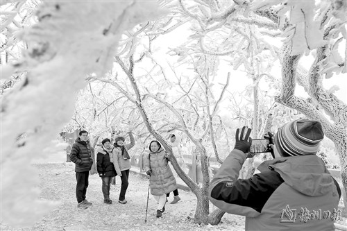 12月12日,游人在江苏省连云港市花果山玉女峰景点雾凇美景中拍照留影。