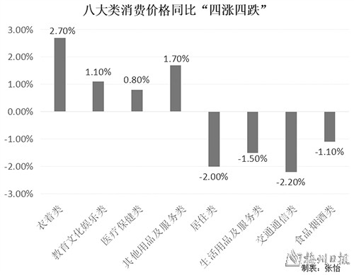 与上月相比,八大类消费价格呈“六跌一涨一平”态势。下跌类别有食品烟酒类、生活用品及服务类、交通通信类、教育文化娱乐类、医疗保健类、其他用品及服务类,跌幅分别为1.1%、0.8%、1.4%、1.5%、0.1%和0.7%;衣着类环比上涨0.7%;居住类价格持平。