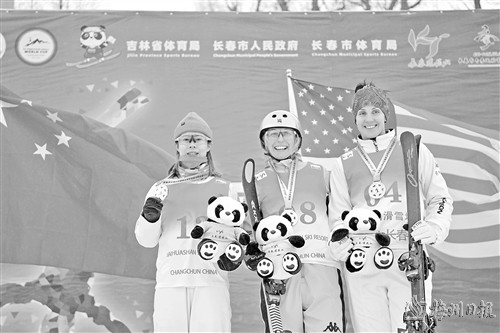 12月16日,冠军美国选手温特·维内茨基(中)、亚军中国选手孔凡钰(左)与季军澳大利亚选手劳拉·皮尔在颁奖仪式上。