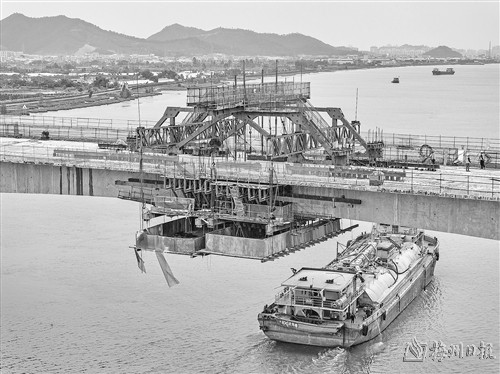 12月17日拍摄的潭江特大桥主跨全幅合龙现场,其下是潭江的通航航道(无人机照片)。