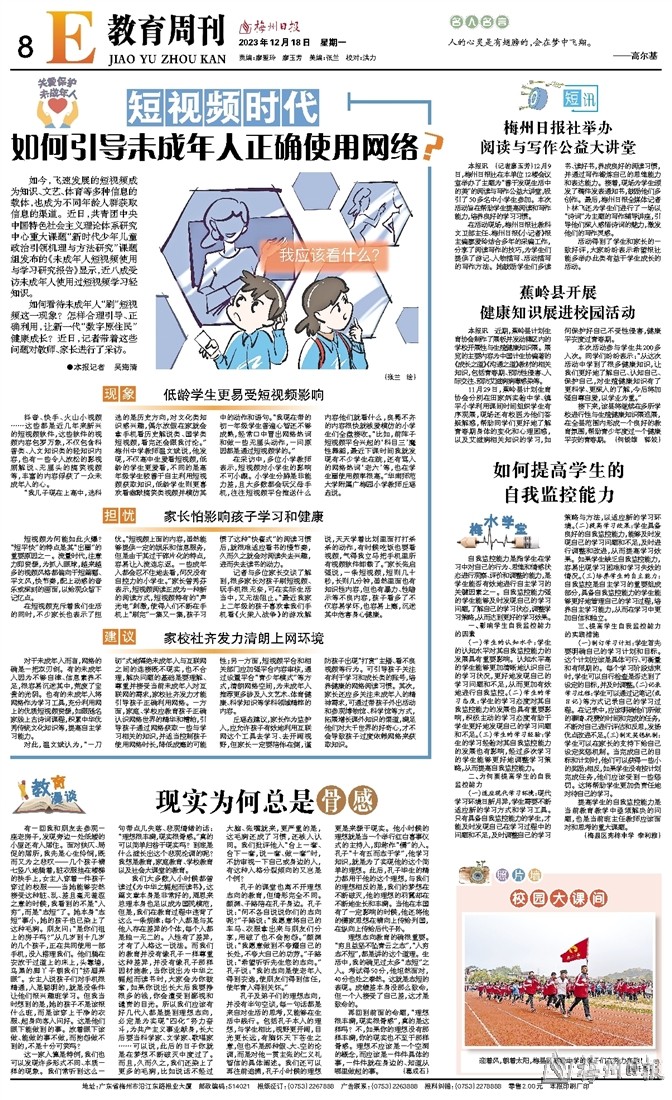 “我儿子现在上高中,选科选的是历史方向,对文化类知识感兴趣,偶尔放假在家就会拿手机看历史解说类、国学类短视频,看完还会跟我讨论。”梅州中学教师温文斌说,他发现,不仅高中生爱看短视频,低龄的学生更爱看,不同的是高年级学生较善于自主利用短视频获取知识,低龄学生则更喜欢看幽默搞笑类视频并模仿其中的动作和语句。“我现在带的初一年级学生普遍心智还不够成熟,经常口中冒出网络热词和做一些无厘头动作,一问原因都是通过短视频学的。”