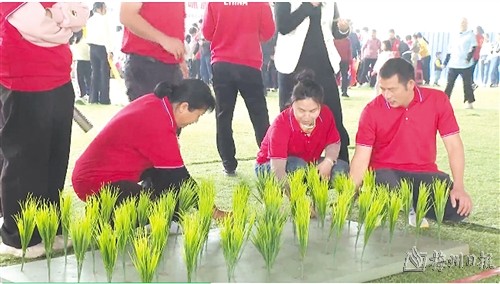 “五、四、三、二、一”,随着全场的倒数,精彩的武术和蹦床表演拉开了赛事序幕。诸葛亮运粮、手把青秧插满田、同舟共济、力拔山河等多个比赛项目有序进行,加油声、呐喊声、掌声此起彼伏,现场热闹十足。在“诸葛亮运粮、手把青秧插满田”比赛项目里,由横陂镇组织的各组村民代表队队员铆足干劲、勇往直前,特别是在运粮和插秧环节,队员们以饱满的热情全力以赴投入比赛,不仅体现了朴素的农耕文明生活方式,也反映了真实生动的乡村民风,让村民更有亲切感和参与感。