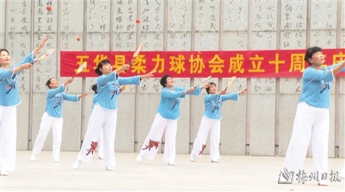 本报讯 今年是五华县柔力球协会成立十周年。近日,五华县柔力球协会特邀太极拳协会在长乐公园书卷舞台联合举办庆典展示活动。