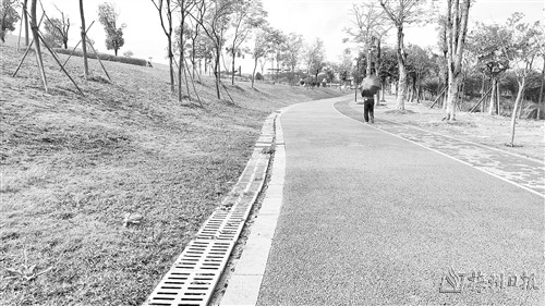 近日,记者再次来到剑英公园,沿着公园环湖道路绕行了一圈,发现公园环湖步道侧原本破烂不堪的围挡已得到了修复,上面挂着的褪色变白公益广告布已被清除,而公园道路边排水沟上大面积破损塌陷的盖板也消失了,取而代之的是崭新排水沟盖板。到了晚上,公园里的灯也明显更亮了,靠近华南大道天桥侧原本漆黑的区域也有路灯。