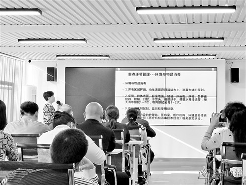 “大家觉得养老行业和哪个行业最相似?”14日下午,养老护理员高级培训师曾小清结合相关案例,阐述了什么是养老机构院内感染,指出了养老机构院内感染容易存在的普遍问题,讲解了院内感染防控要点。现场培训的学员听得入神,不时拿起手机拍下知识要点。理论知识讲解完后,曾小清还组织进行了实操练习,通过情景模拟的方式展现如何科学为老年人人工取便、协助对Ⅱ度压疮老年人做出正确照护等。“我开养老院已经13年了,这次培训干货满满,很多培训的知识在日常养老护理中都能用得上,让我受益匪浅,回去之后我会查缺补漏加以完善,同时分享普及学到的养老护理知识。”坭陂镇长寿托老院院长罗慈红说。
