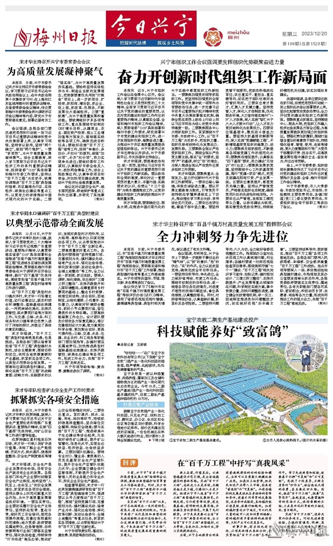 “我们始终坚持科技引领、创新为主。”李志鹏表示,宝宁农牧不仅与中山大学现代农业生物技术研究院、嘉应学院生命科学学院进行产学研合作,共同培育“兴宁鸽”新品种,提高肉鸽生产水平,引领肉鸽行业发展,同时加强企业自主研发创新,创新研发了仿生态螺旋式喂料装置、鸽蛋受精情况检查装置、易于清理粪便的吊装式鸽笼等8项专利,大大改善了肉鸽养殖设备的智能化程度。投产至今,宝宁农牧先后被评为“广东省石岐鸽保种场”“广东省畜禽养殖标准化示范场”“广东省现代化美丽牧场”“粤港澳大湾区‘菜篮子’生产基地”,获得“鸽越鸽”“李大鸽”“爱尚鸽”等商标。