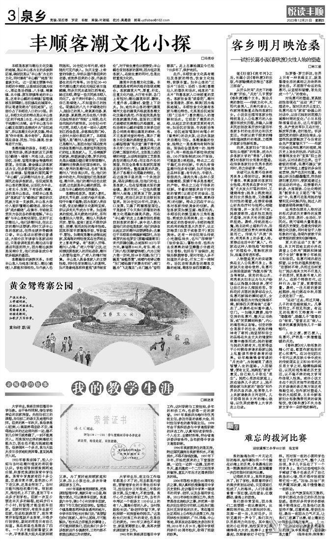丰顺是客家与潮汕文化交融的地域,是以半山客为主的多族群区域,确切说是以“半山客”为主的文化,同时兼有“半山鹤”“纯客”和畲族文化。 这一区域主要集中在丰顺的中南部,以县城汤坑镇为核心,周边是汤西镇、八乡镇、埔寨镇、北斗镇、原东联镇等地的半山客,还有半山鹤的汤南镇(留隍镇被东联隔断),汤坑镇在此域居中,所以笔者简称为“汤坑地面”。这部分占了丰顺总人口的2/3强。所以,丰顺文化总的特点是以半山客(区别于纯客)为主、半山鹤(区别于纯潮州)为辅。由于半山客与半山鹤主体居住连接成片为“汤坑地面”,所以客潮文化水乳交融,特点是“你中有我、我中有你”。具体表现在语言、民性、习俗、建筑、饮食等若干方面。