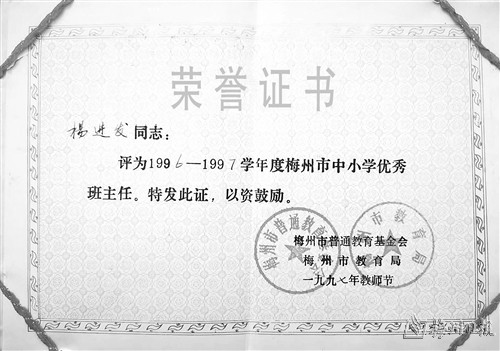 1992年秋我被调回潘田中学工作,这时职称与工资挂钩,多年的积极工作,也获得一定的荣誉。1997 年我被评为梅州市优秀班主任,参加市里的表彰大会,同时担任学校的教导副主任。1999年由于我积极参与中学高级职称的评选工作,认真写好述职报告、个人论文、业绩材料等,符合省高评委评审条件,当年获得中学语文高级职称。