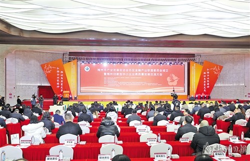 12月22日上午,梅州市产业发展促进会苏区金融产业联盟委员会成立暨梅州创新型中小企业高质量发展交流大会在世界客商中心举行。