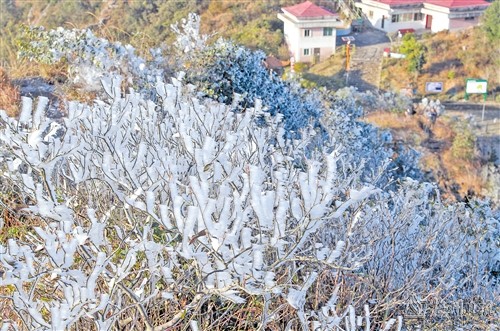 昨日早晨,记者在五指峰景区看到,山顶上一派银装素裹,草丛林木均裹上了一层厚厚的霜花,冰晶在阳光的照射下愈显晶莹剔透,山风吹过,树木的枝条“咯吱”作响,美丽的雾凇景观令人叹为观止。