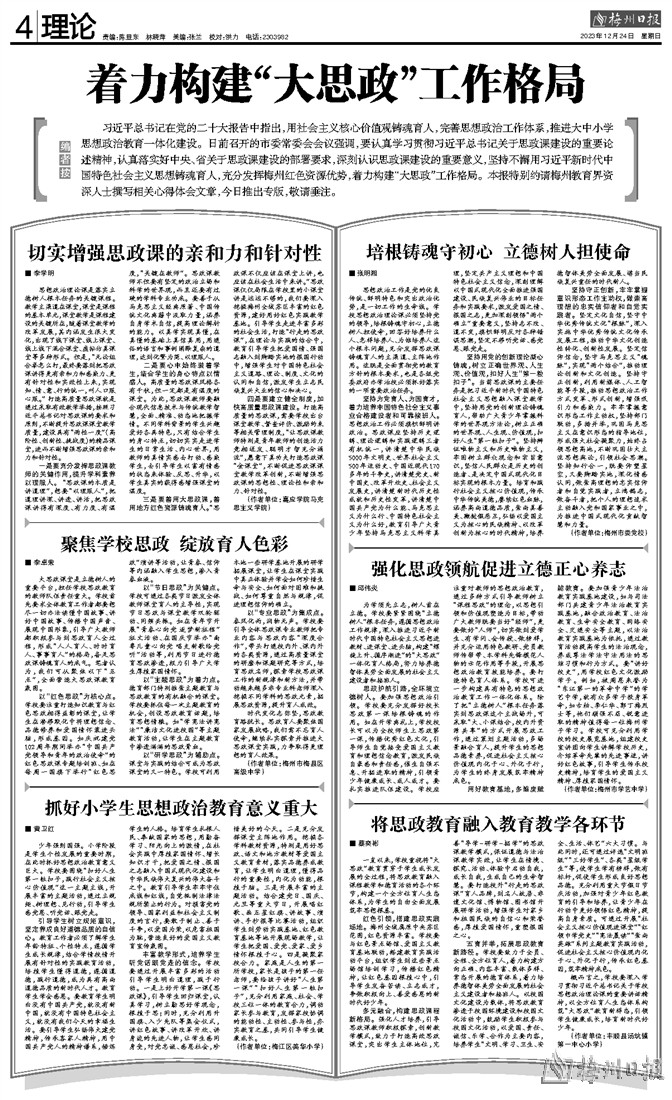 习近平总书记在党的二十大报告中指出,用社会主义核心价值观铸魂育人,完善思想政治工作体系,推进大中小学思想政治教育一体化建设。日前召开的市委常委会会议强调,要认真学习贯彻习近平总书记关于思政课建设的重要论述精神,认真落实好中央、省关于思政课建设的部署要求,深刻认识思政课建设的重要意义,坚持不懈用习近平新时代中国特色社会主义思想铸魂育人,充分发挥梅州红色资源优势,着力构建“大思政”工作格局。本报特别约请梅州教育界资深人士撰写相关心得体会文章,今日推出专版,敬请垂注。