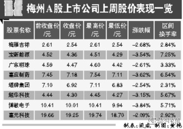 上周,受大盘整体走势不佳的影响,梅州8家A股上市公司股价表现均为下跌。其中博敏电子领跌,跌幅为3.84%。梅雁吉祥、广东明珠、塔牌集团、嘉元科技跌幅较小,分别下跌2.68%、2.61%、2.54%、2.09%。8家上市公司股价平均下跌3.01%。