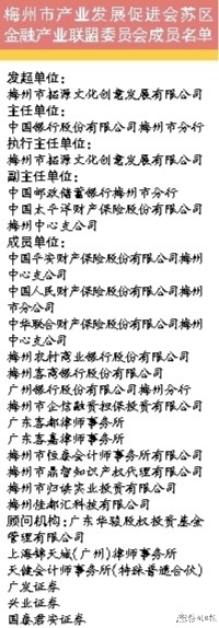 梅州市产业发展促进会苏区金融产业联盟委员会(以下简称“苏区金融产业联盟委员会”)是由梅州市金融工作局指导,梅州市产业发展促进会倡议发起,共同打造“共建共享、开放融合、互助共进、多方协同”的合作平台,将围绕“1+2+N”的运营思路,打造“梅州隐形冠军”“梅州金融栏目”两大金融品牌活动。其中,“1”即发起成立一个“产业基金”;“2”即构建“一站式金融服务平台”“企业上市综合服务平台”两大服务平台;“N”即打造多个金融服务驿站。
