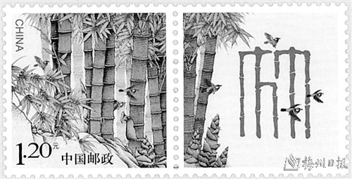 “不谢东君意,丹青独立名。莫嫌孤叶淡,终久不凋零。”四季青翠的竹子,以其挺拔不屈,节实心虚而成为谦逊坚贞、刚直不阿高尚品德的象征。1982年7月31日,原邮电部发行的《明清扇面图》特种邮票的第3枚“竹雀图”(图④),画面描绘了一群鸟雀栖集竹林间;1993年6月15日,原邮电部发行《竹子》特种邮票一套4枚,图案分别为“紫竹”“金镶玉竹”“佛肚竹”和“茶杆竹”。另发行小型张一枚,图案为“毛竹”。该套邮票画面上的五种竹子,均是我国的特产和有代表性的竹种。1993年11月22日发行的《郑板桥作品选》邮票一套6枚,其中第1枚(图⑤)、第3枚和第4枚邮票图案均为竹子;2010年10月18日发行的《梅兰竹菊》特种邮票的第3枚“竹”,主图选自清代画家郑板桥的《兰竹画册》;2014年5月28日发行《竹》个性化服务专用邮票一套1枚(图⑥)。