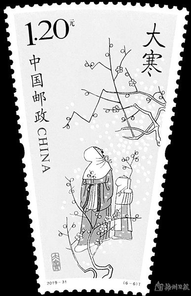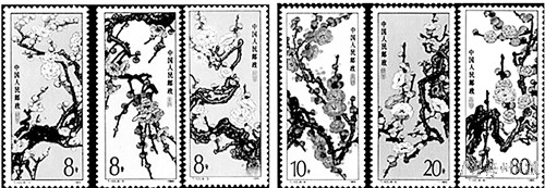 “墙角数枝梅,凌寒独自开。遥知不是雪,为有暗香来。” 傲雪报春的梅花是中华民族的精神象征,代表着高洁、坚韧与顽强。1982年9月29日发行的《中日邦交正常化十周年》纪念邮票,其中第一枚主图为怒放的梅花;1985年4月5日我国专门发行了《梅花》特种邮票一套6枚(图⑦)。图案分别为“绿萼”“垂枝”“龙游”“朱砂”“洒金”和 “杏梅”。另发行小型张一枚,图案为“台阁”“凝馨”。该套邮票描绘的梅花形象千姿百态,栩栩如生,争奇斗艳,各领风骚;2003年12月6日发行的《毛泽东诞生110周年》邮票的第4枚,背景画面配毛泽东诗词《卜算子·咏梅》:“风雨送春归,飞雪迎春到。已是悬崖百丈冰,犹有花枝俏。俏也不争春,只把春来报。待到山花烂漫时,她在丛中笑 。”毛主席的诗词塑造了梅花傲霜斗雪、坚韧不拔、乐观自信的形象,鼓励人们要有坚强不屈、艰苦奋斗的优秀品质和革命到底的乐观主义精神。2019年11月8日,中国邮政发行的《二十四节气(四)》特种邮票第6图“大寒”(图⑧),邮票画面是雪花飘飘的严冬一老一小在户外欣赏梅花的场景,儿童怀抱着的瓶子还插有一枝梅花。