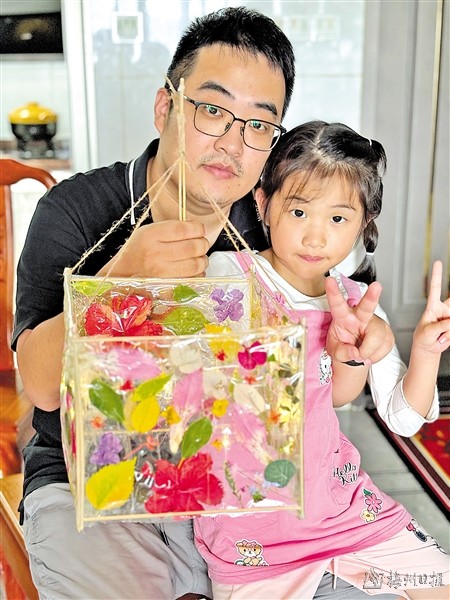 周末,女儿一大早就到公园里捡花瓣,然后拿回家和爸爸一起亲手做了这个美丽的“花”灯。